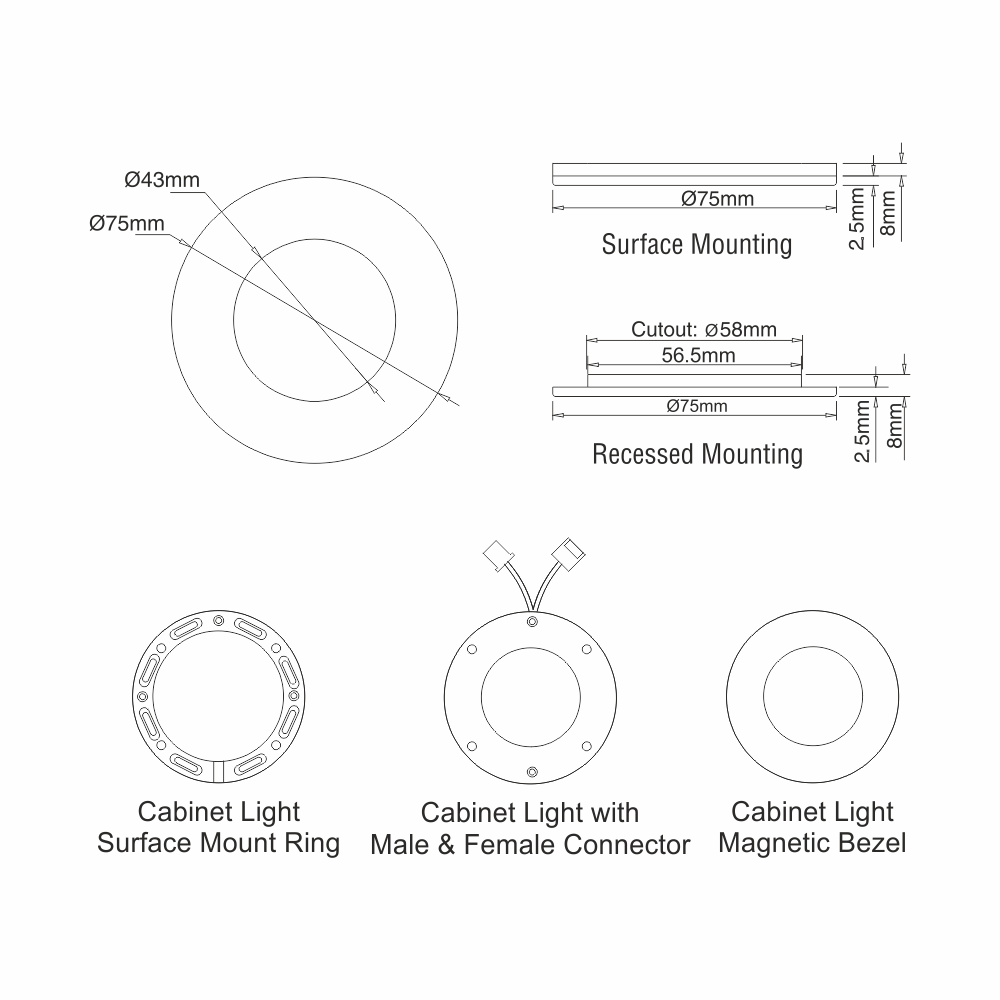 • 1 x Ultra slim Cabinet Light with male & female connectors